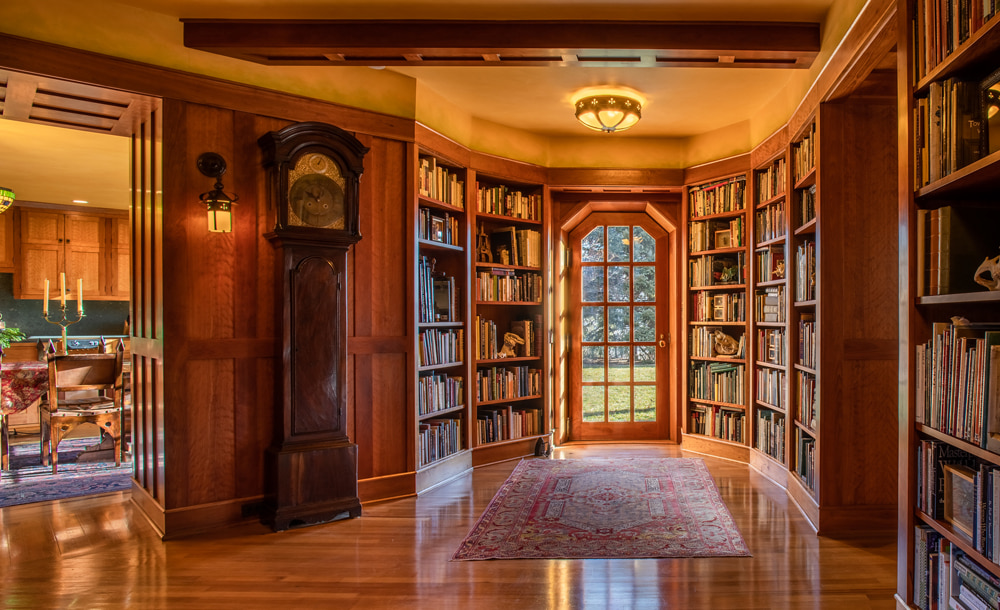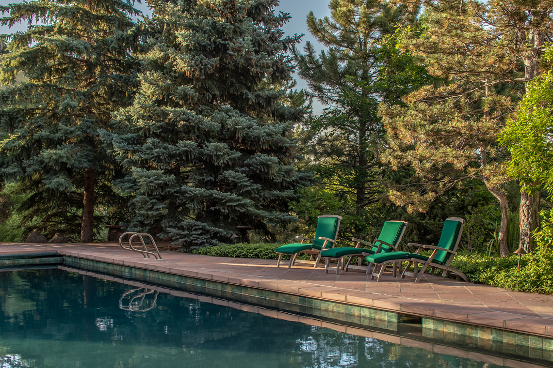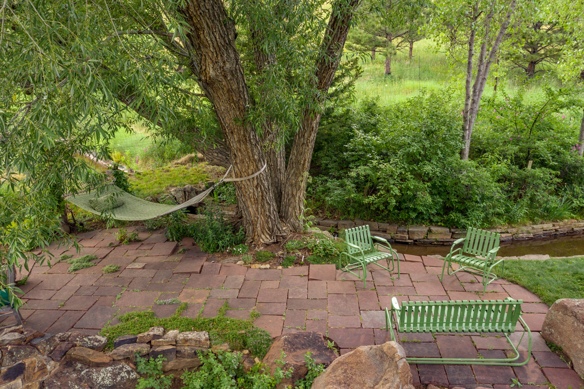 In the summer, a dark swimming pool surrounded by trees cools the spirit. A small creek flows from the top of the property where a big hammock looks up through willow leaves to the sky.